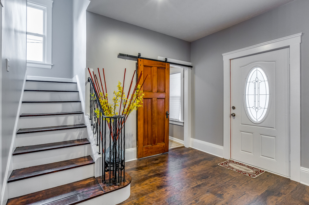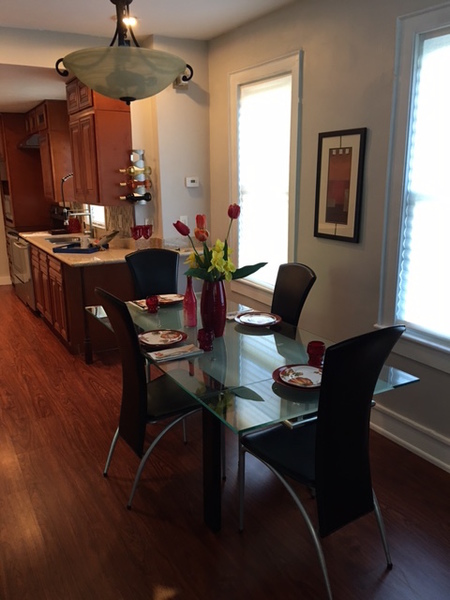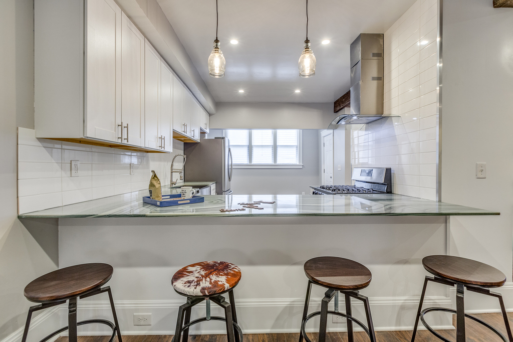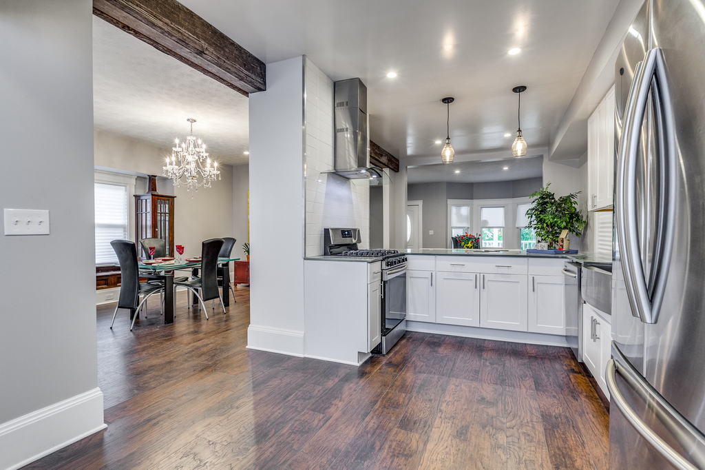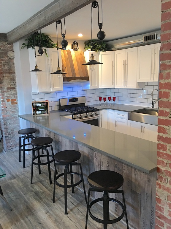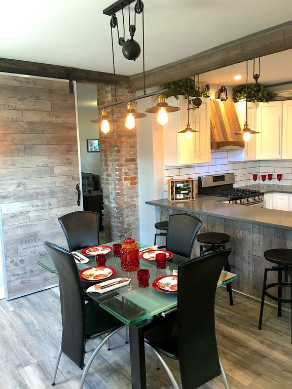 1st floor features open concept kitchen with crisp clean white cabinets, white subway tiles, gray quartz countertops combined with rustic air-ducts, old world lighting fixtures with Addison's lightbalbs and exposed chimneys. Stainless steel appliances and entertainers bar that overlooks dining area and spacious living room make this house an entertainer's paradise. True generation Z custom build sliding bar door with vine motif leads to 3rd bedroom that right now is set up as an office.Conveniently 1st floor features half bathroom on the way to 1 car garage.
