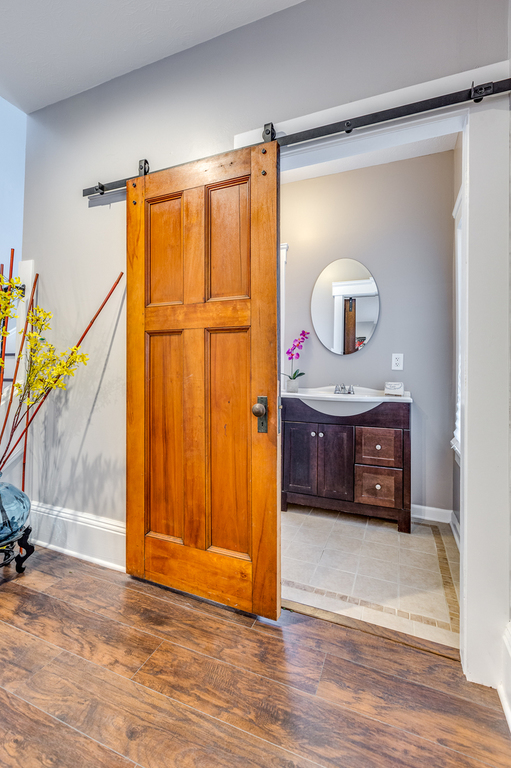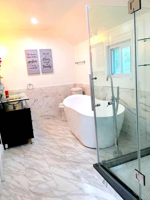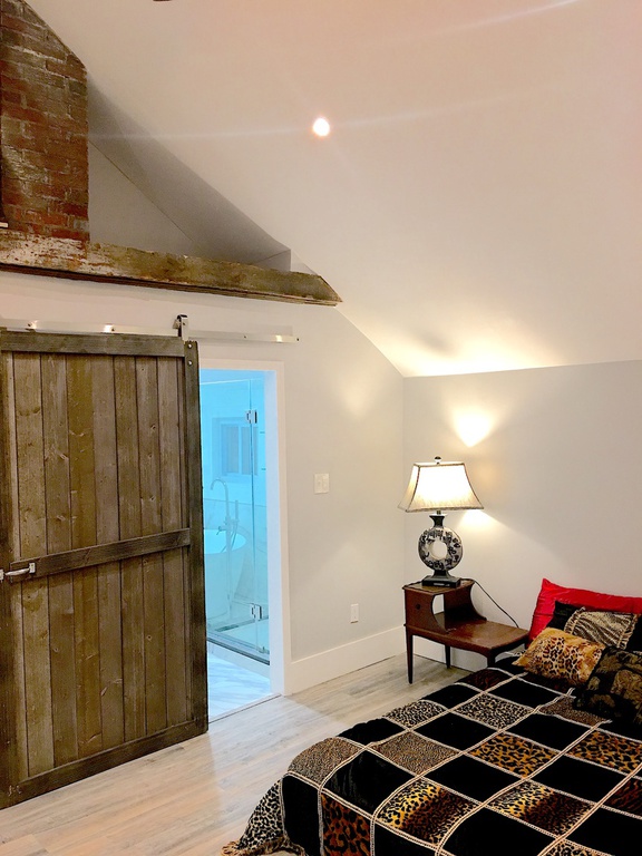 Single family is a rustic charm beaty with most modern green standard certified amenities. Upstairs masters bedroom with vaulted ceiling and exposed beams, has a walk in dressing room for her and separate closet for him. Behind custom build sliding barn door is adjacent spa-like masters bathroom with freestanding tub and separate shower featuring electronic water temperature control shower faucet and ultramodern dual sink glass vanity. Upstairs 2nd bedoom had adjacent full bath and walk in closet.Laundry room is conveniently located on the 2nd floor.