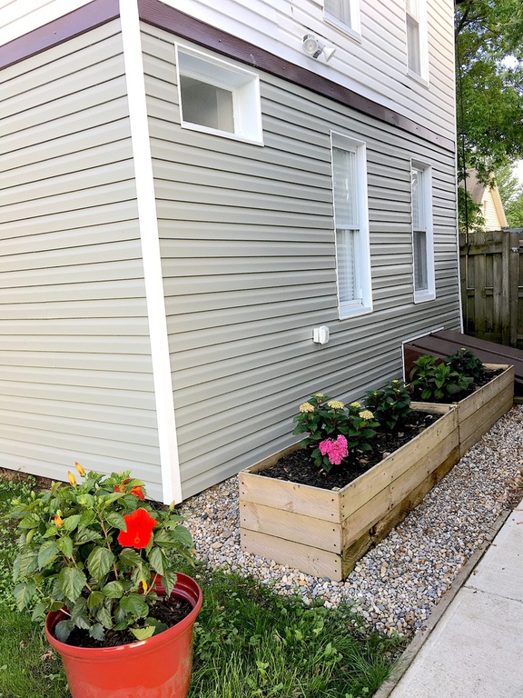 Outside features fully fenced yard with beautiful vertical herb garden lush flowers and ample space for outside grilling parties.